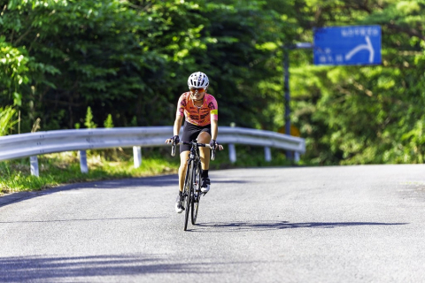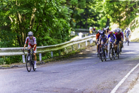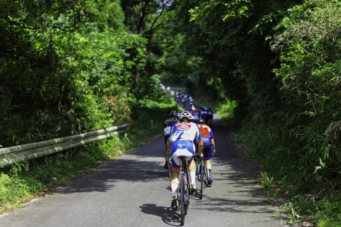 真夏の日差しの中、あぶくま洞ヒルクライム第2ステージを登る選手達