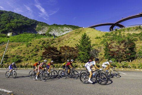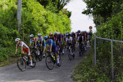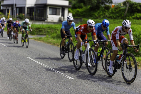 連続するコーナーや細かい起伏で、集団は⻑く一列棒状に引き延ばされる苦しい展開