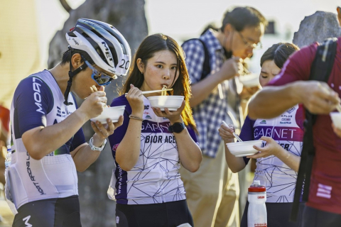 ゴール後には地元の名産品で美味しいおもてなし。冷やしじゅうねんうどんも大人気