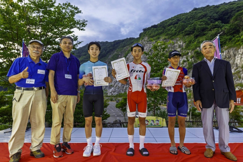 あぶくま洞ヒルクライム中学生男子の表彰式。左3人目から2位・矢吹、優勝の柬理、3位・水沼