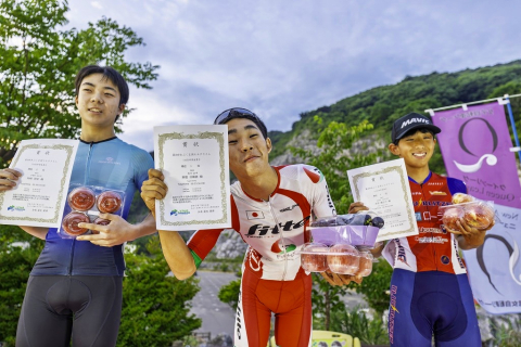 得意のヒルクライムで回心の走りを見せた柬理は表彰式でも盛り上げた