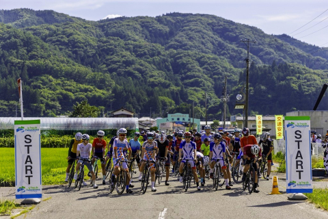 第1ステージスタートは滝根町の雄大な野山がバック。この後、入水鍾乳洞へに向かう