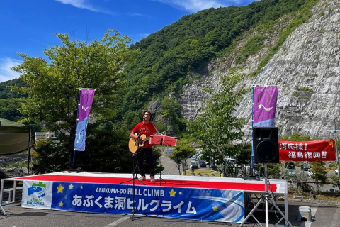 両大会とも特設ステージではライブイベントも開催。あぶくま洞ヒルクライムではシンガーソングライター・三穂りょうすけ氏が登場