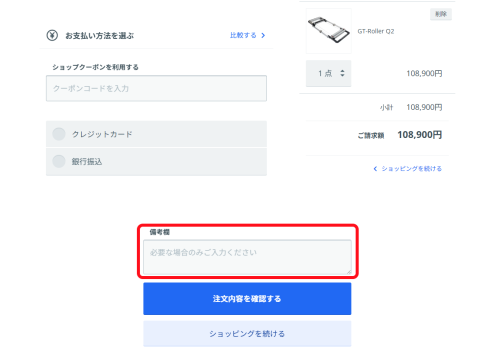 GT-ROLLERを購入時にショッピングカート画面の下部にある備考欄に希望のプレゼントを記入する