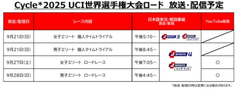Cycle*2025 UCI世界選手権大会ロード 放送・配信予定