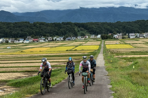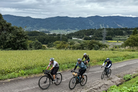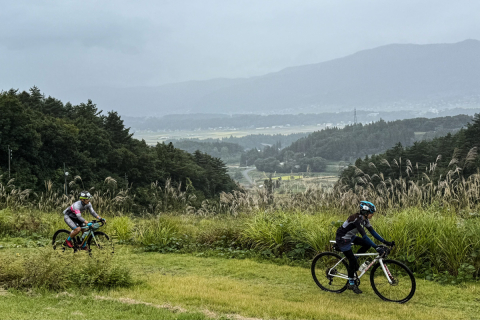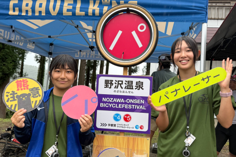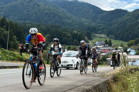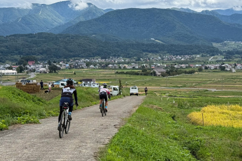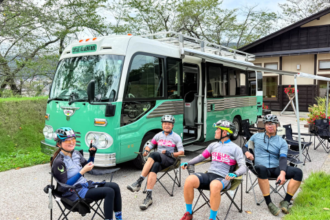 いいやま観光局自慢の信越自然郷サイクルツアーサポートバスで休憩