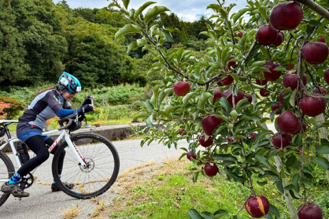 真紅の林檎が道端にいっぱい。「美味しそう〜」