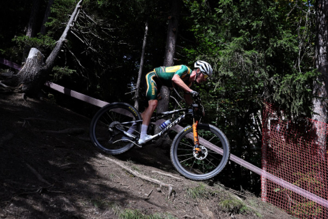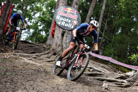 木の根が連なるダウンヒル区間を攻めるクリストファー・ブレヴィンス(アメリカ)