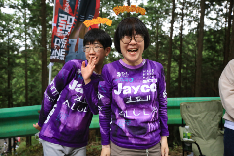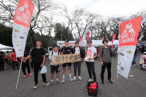 毎年手作りジャージで応援する上田さん親子。白Tシャツから染めたジェイコジャージが力作