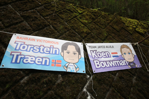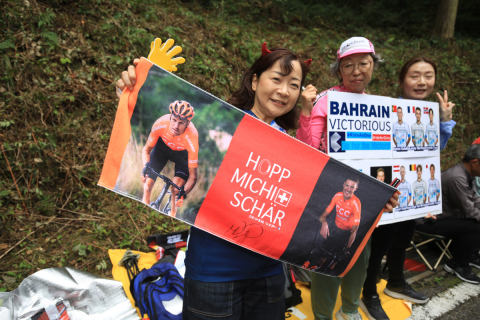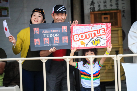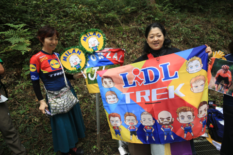 ポギチームとリドル・トレックのジャージのうちわで応援