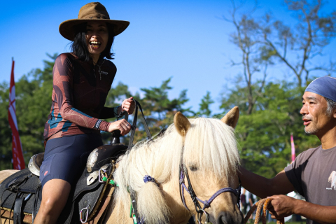 乗馬体験では白馬育ちの道産子、白馬のかえでちゃんに乗れる