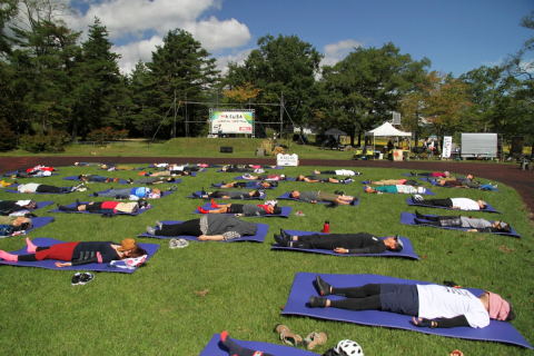 ライド前にみんなで朝ヨガ。「これが自転車イベント?」という雰囲気だ