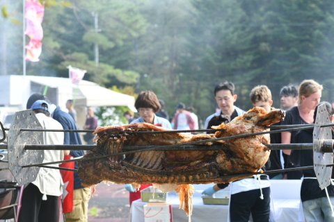 白馬の精肉店「大国屋」の社長が6時間をかけてじっくりと焼き上げた豚の丸焼き