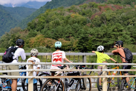 まるで日本昔ばなしの風景を行く親子サイクリスト