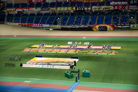 バンク中央には寬仁親王牌・世界選手権トーナメントの大きな切り抜き文字と、ポスターと同じ写真をあしらったステージ