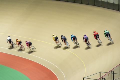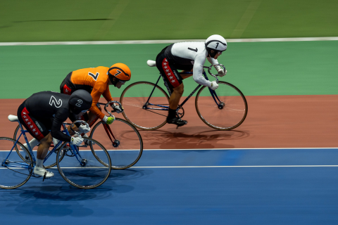 急傾斜のコーナーから、選手達がスピードに乗って捲っていく