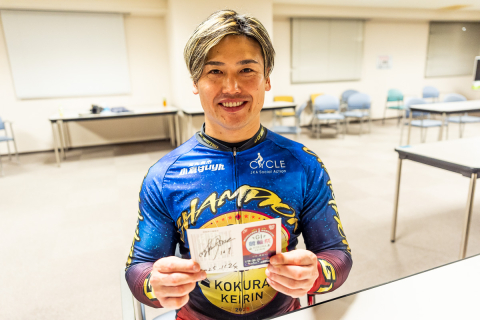 嬉しそうな表情でサインを入れたQUOカードを手にしてくれた阿部拓真選手(宮城)