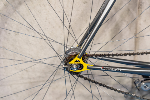 GT-Rのダークメタルグレーをメインカラーに、ブラックとイエローがバランス良く配されたブリヂストンのフレーム