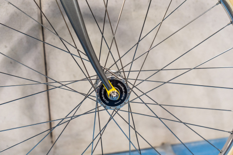 結線されたフロントスポーク。フォークエンドのイエローのワンポイントが映える