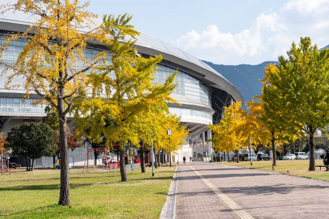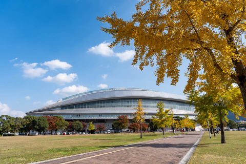 競輪祭・競輪祭女子王座戦の開催地・北九州メディアドーム。公園の銀杏の紅葉が美しい