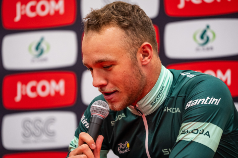 記者の質問に答えるヨナス・ヴィンゲゴー(デンマーク、ヴィスマ・リースアバイク)