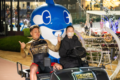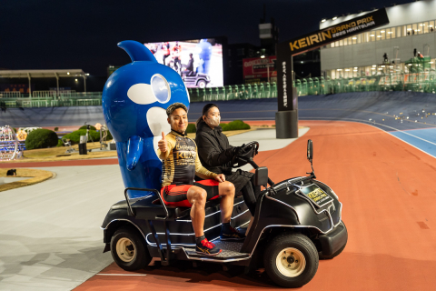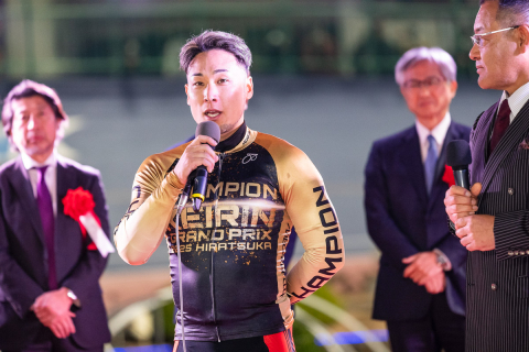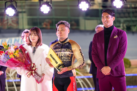 平塚競輪アンバサダーの篠崎愛さんと、花束プレゼンターの槙野智章さんと並び、記念撮影を行う郡司浩平(神奈川)