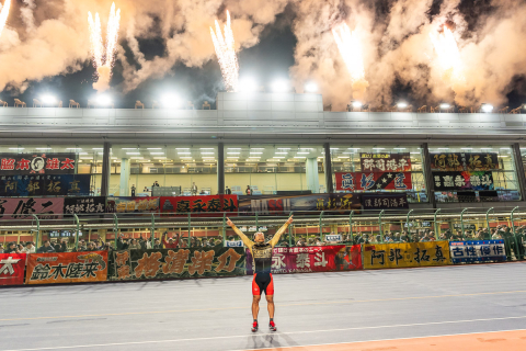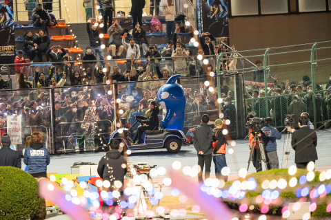 炎の演出とともにカートで表彰式に向かう郡司浩平(神奈川)