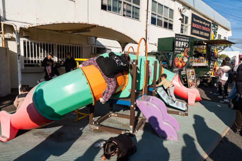 遊具場では子供達が元気にはしゃぐ。大人が考えないような遊び方をするのが子供(笑)