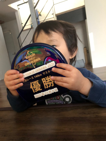 優勝メダルと息子。「おとうちゃん頑張ったで!」