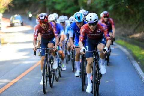 集団先頭で普久川ダムへの登りをクリアする高岡亮寛
