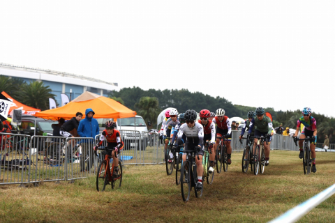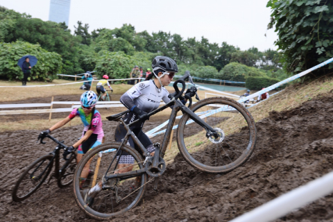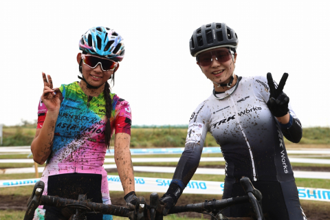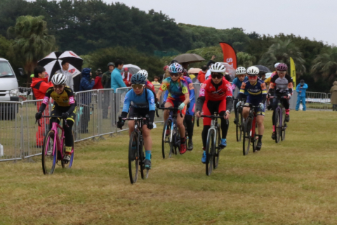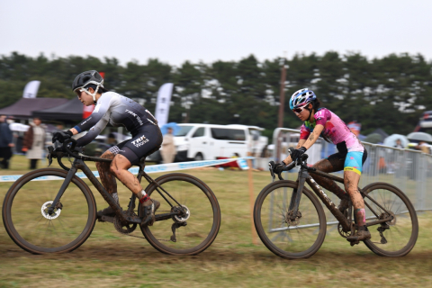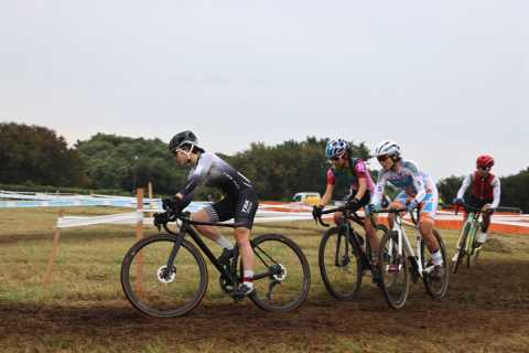 忍者返しで女子エリートの石田唯(TRKWorks)と女子ジュニアの日吉彩華(Asia Union TCS Racing Team)が先頭パックを形成