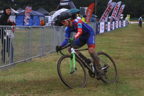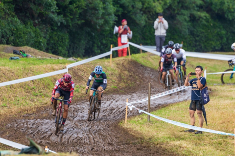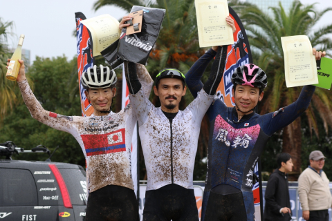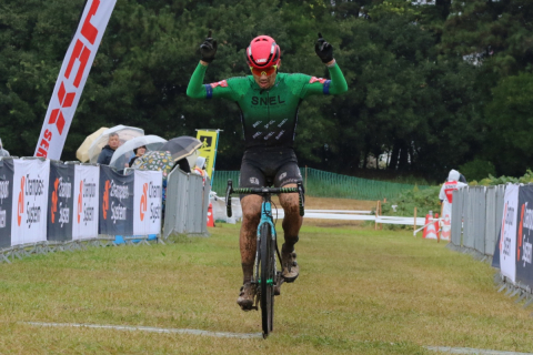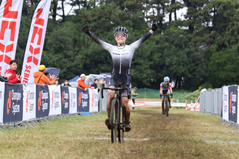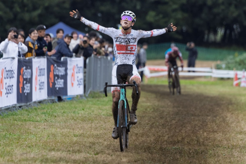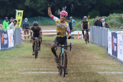 織田聖(弱虫ペダルサイクリングチーム)は大きく手を広げながらフィニッシュラインを通過し、今シーズンのJCXで初優勝を上げた