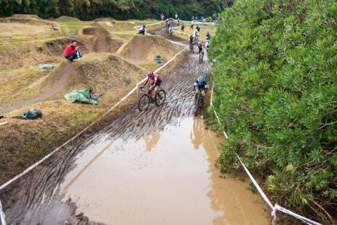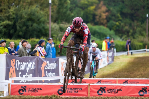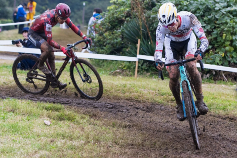 森林区間のマッドコンディションで沢田時(Astemo宇都宮ブリッツェン)と鈴木来人(OnebyESU-ICV)が抜け出す