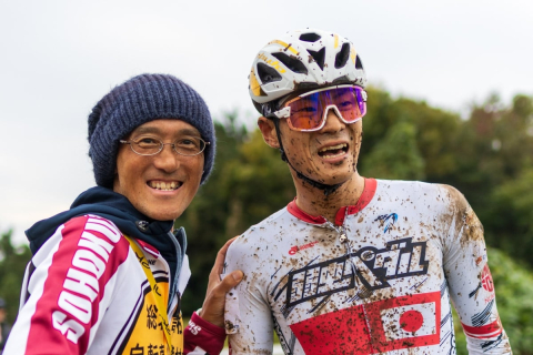 弱虫ペダルの渡辺先生と喜びを分かち合う織田聖(弱虫ペダルサイクリングチーム)