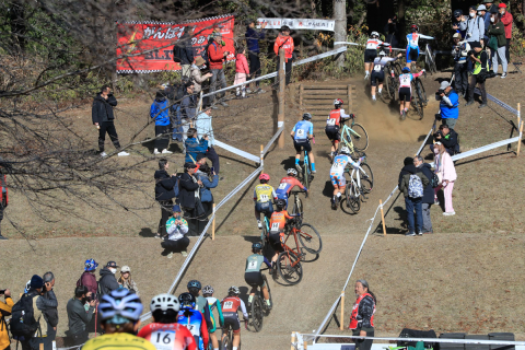 画像 三段坂で先頭の小林あか里(Liv Racing Japan)がバイクを押して登ったため、先頭付近は全員がバイクを押していく photo:Makoto AYANO 2025/12/07 - 20:22