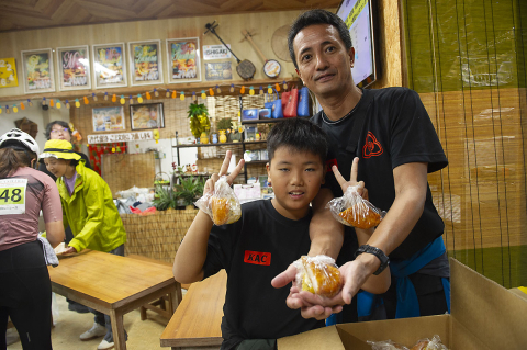 エイドで新城幸也さんと一緒に。左はお父さんの貞美さんphoto:Hitoshi Omae
