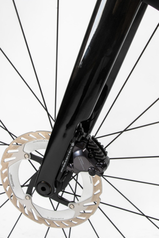 キャリパー取り付け部もオフセットされ、エアロ性能に寄与する形状に