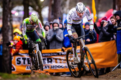 食い下がるフェルストリンヘを従えて走るマチュー・ファンデルプール(オランダ、アルペシン・プレミアテック)