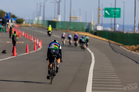 ローリング周回中の女子スポーツ出場選手たち。写真のゴールへ向かうストレートは斜め向かい風