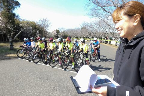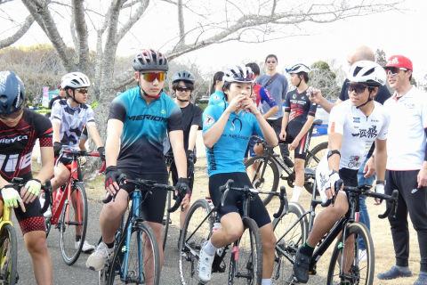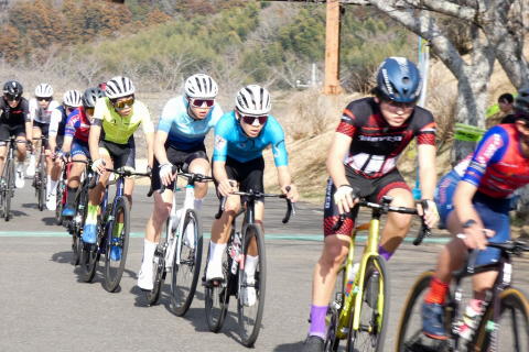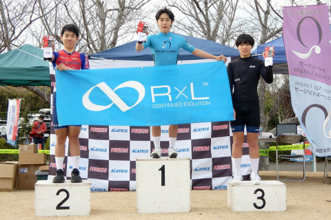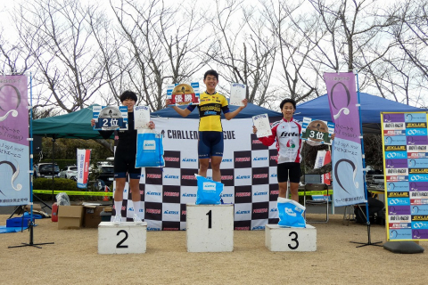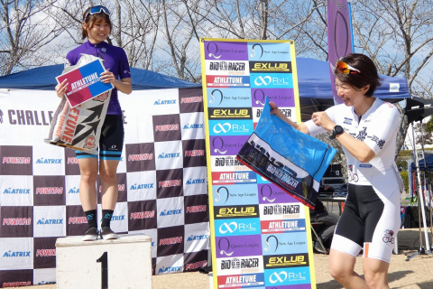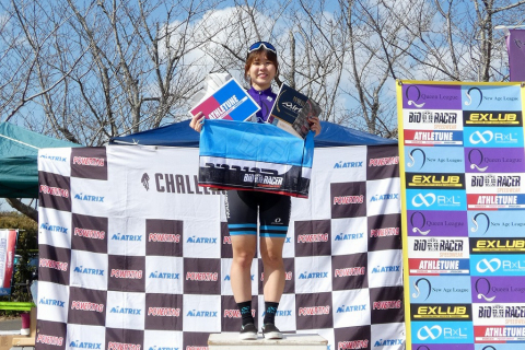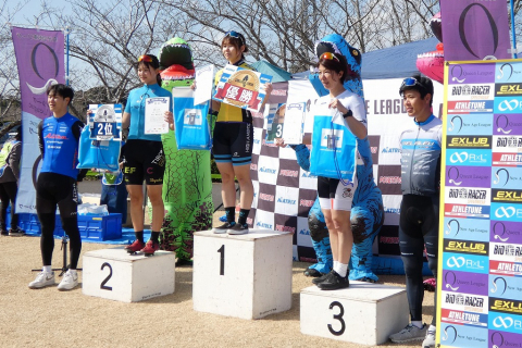 画像 プレゼンターのゲスト織田聖(愛三工業レーシング:左端)と岡崎一輝(シエルブルー鹿屋:右端)に祝福されるレディースレース上位3名。左2人目から2位・岡田、優勝の岡本、3位・根本 photo:QNリーグ事務局 2026/03/10 - 15:38