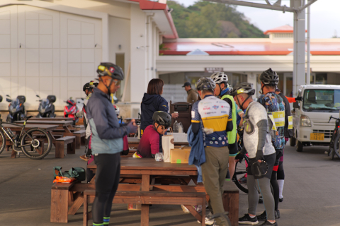 朝陽の眩しい本部のエイドで©ちゅらうみ海道サイクリング2026