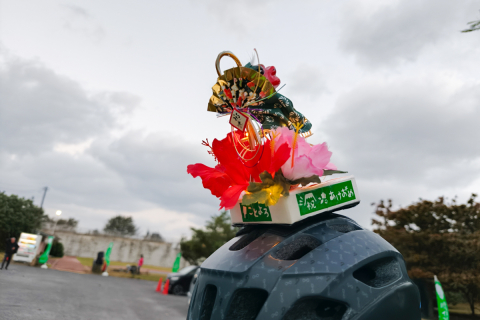 参加者のヘルメットに付けられた迎春のお飾り©ちゅらうみ海道サイクリング2026