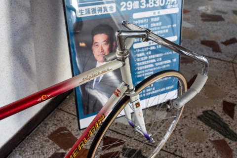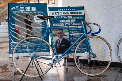 日本競輪選手養成所のエントランスには滝澤正光前所長と、神山雄一郎所長の現役時のピストが展示されている