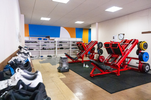 候補生の運動靴が並び、レッグプレスマシンが鎮座する体育館の入口