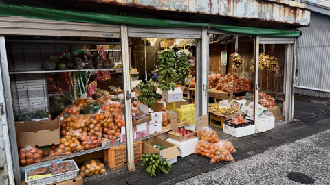 名瀬の中心部にある元治(もとじ)青果店 。味わい深い光景だ