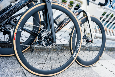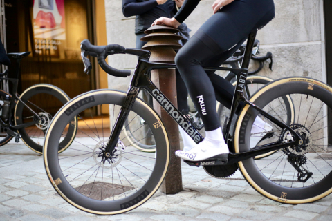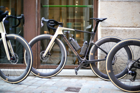 テストライドを待つSuperSix EVO Hi-Mod。シャンパンゴールドのフレームが街に映える