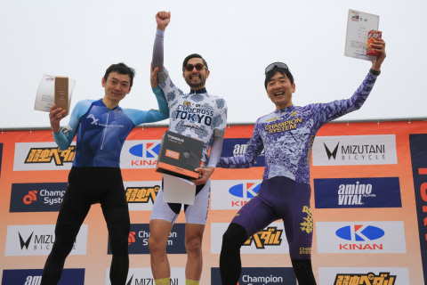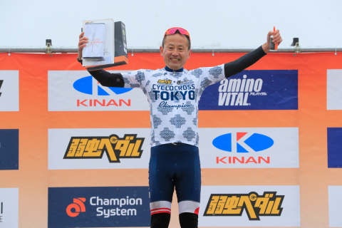 ME4-Aで優勝し、チャンピオンジャージを着用する高橋史朗(RINFINITO)