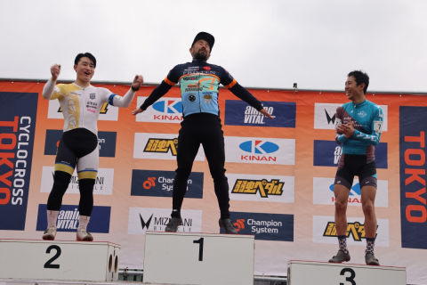 CX世界選手権でマチュー・ファンデルプール(オランダ)がしたゴールポーズで登壇した中間森太郎(FRIETEN)