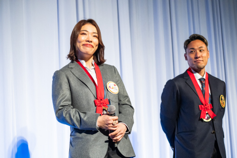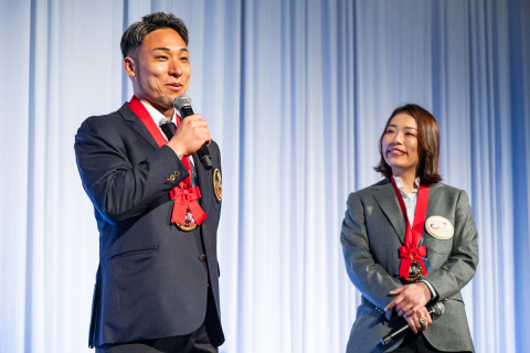 トークショーに登場した郡司浩平と佐藤水菜。神奈川で最優秀選手の同時受賞は初