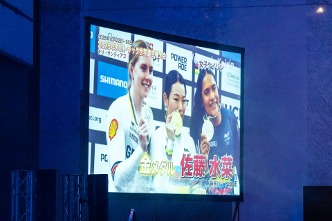 祝賀会会場には窪木一茂(福島)らナショナルチームの活躍が映し出されていた